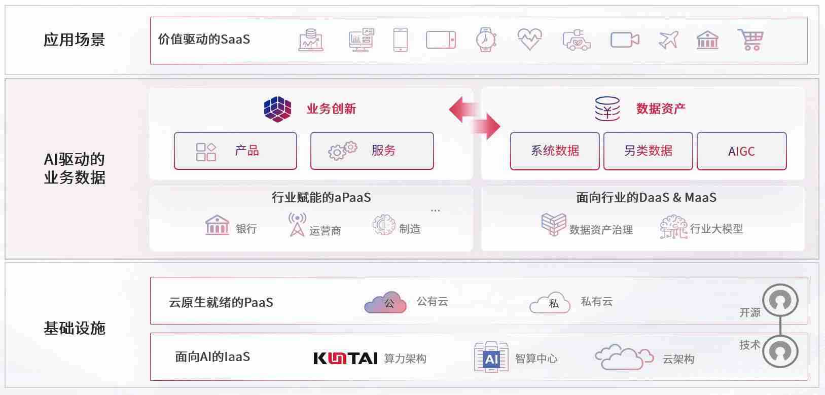 数字时代,,围绕企业数字化转型的关键要素,,,,尊龙z6数码开创性的提出数云融合战略和技术体系框架,,,,着力在云原生、、、、数字原生、、AI原生和信创产业上架构产品和服务能力,,,,为处在不同数字化转型阶段的快消零售、、汽车、、金融、、医疗、、、政企、、教育、、、运营商等行业客户提供泛在的敏捷IT能力和融合的数据驱动能力,,,,构建跨界融合创新的数字业务场景和新业务模式,,,助力企业级客户建立面向未来的核心能力和竞争优势,,,,全面推动社会的数字化、、、智能化转型升级。。。